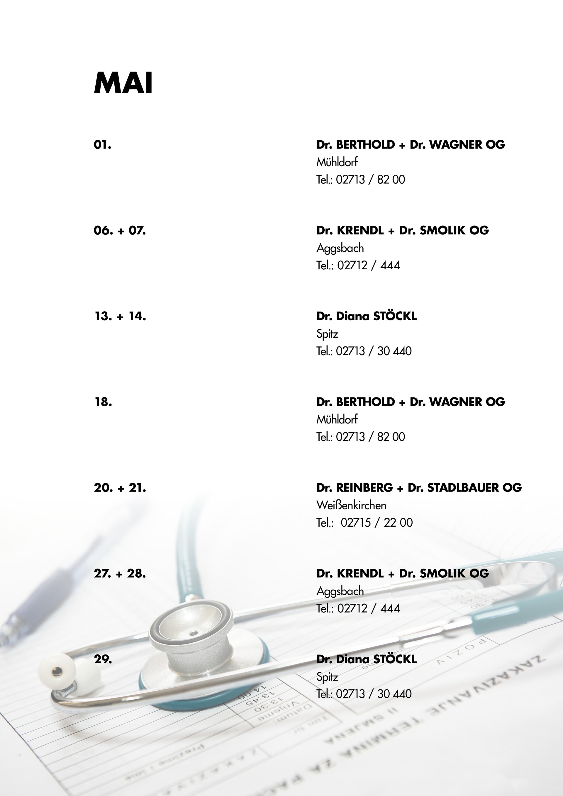 Seit 1.7.2019 umfasst der kassenärztliche Wochenend- und Feiertagsdienst ausschl. die Zeit zwischen 8:00 Uhr und 14:00 Uhr. Ordinationsbetrieb ist von 9:00 bis 11:00 Uhr.